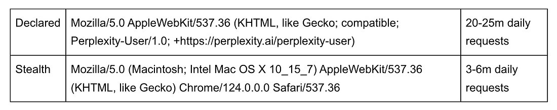 Three weeks ago, Cloudflare published a hit piece against Perplexity claiming that Perplexity’s scraping bot was not obeying robots.txt. They went further, and showed that even when Perplexity is blocked by a site’s WAF, it leverages stealthy, browser-based scraping obscured through residential IPs to avoid detection (see the above image depicting this architecture). Cloudflare cited 3-6M daily requests from a stealth scraper built on top of Browserbase.