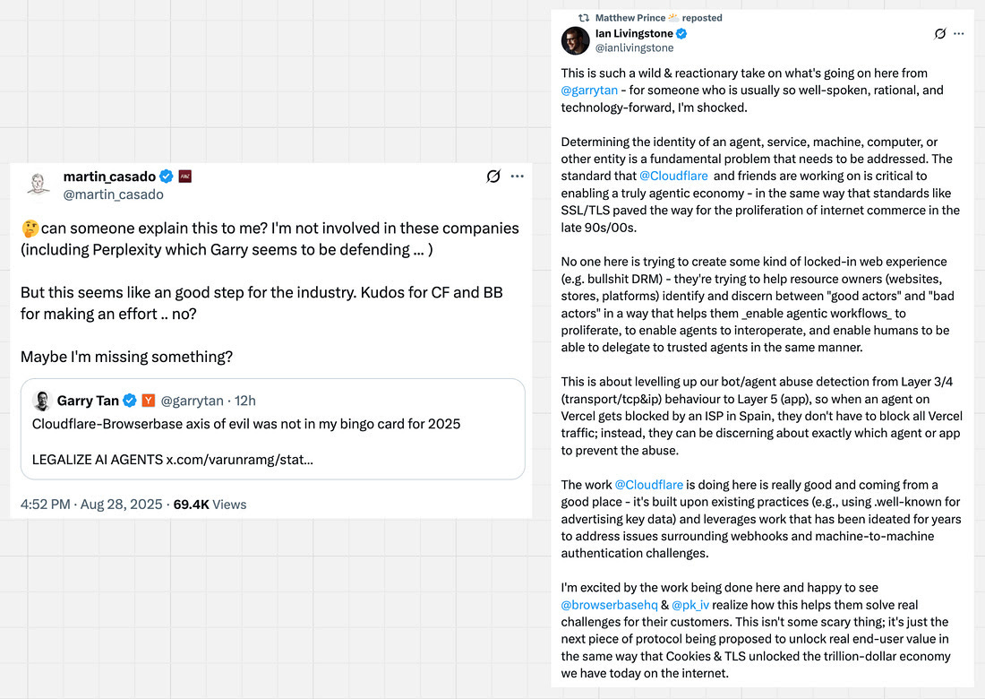 If perplexity is right (which it seems like they may be), this is concerning. Cloudflare is one of the central guardians of the internet and they do have a major role to play in ensuring that agents responsibly access resources on the internet. Agents consume compute resources, content, and potentially human capital at the sites, merchants, & services they interact with.